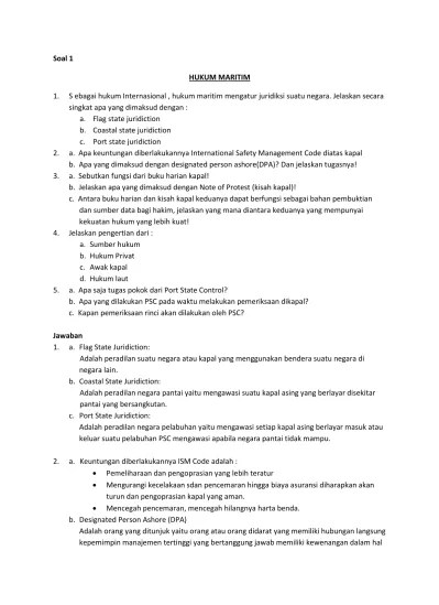 Hukum maritim (maritime law) adalah hukum yang mengatur tentang pelayaran dalam arti transportasi laut dan kegiatan yang terkait dengan . Membuat jalur pelayaran dan melakukan koreksi terhadap peta laut dan buku. Yaitu dasar laut dan tanah di bawahnya di luar sampai kedalaman 200mtr masih Soal ujian negara ant 2. Selamat sore para pelaut muda calon perwira kapal.